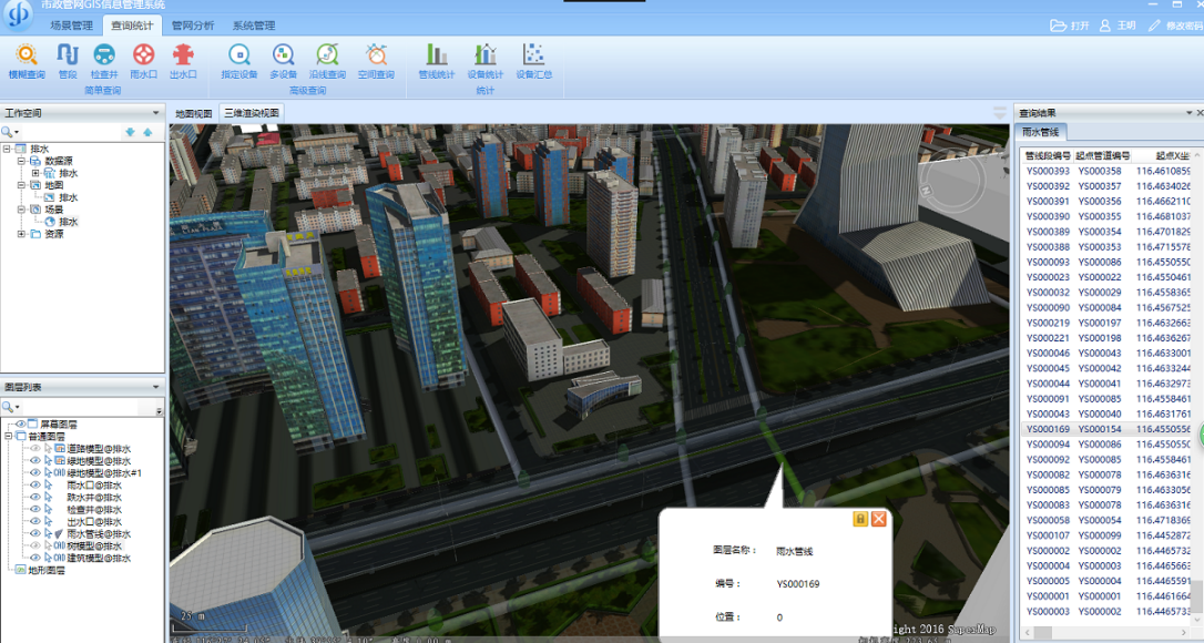 支持管網數據二三維一體化同步更新,可通過選擇不同專題圖進入二維或者三維場景。系統支持地上建筑設施、地下管網設施三維化動態建模和場景漫游功能,在三維場景下,可多角度追蹤查看管網設備設施屬性信息并進行空間量算,三維場景下管線開挖模擬敷設物料消耗以及挖方量核算功能,為現場管網施工提供造價依據。